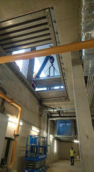 Due to a massive enhancement of boiler plant and ancillaries we were contracted to assist on a major crane lift operation. The new boiler plant would not fit through the stainless-steel pavement supports into the basement area beneath the pavements, we needed to cut away the stainless-steel gutters directly underneath the pavement prior to the supports being removed. This was done with a twelve-inch disc cutter used at head height whilst six metres high on a scissor lift.